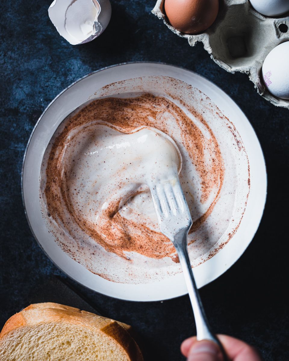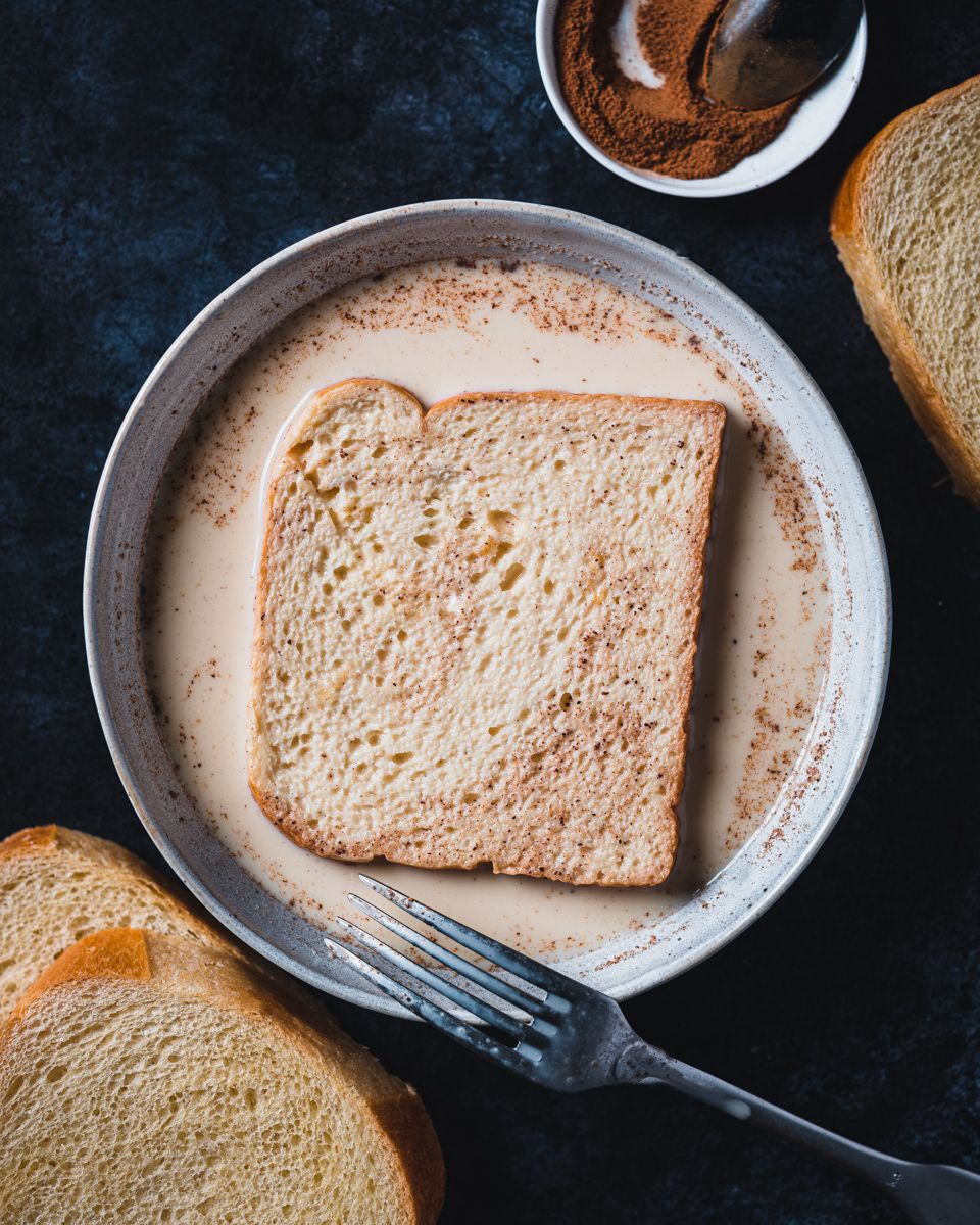 2:Hell blandingen over på en tallerken med litt høye kanter. Vend brødskivene i eggeblandingen slik at de blir gjennomdynket. Ikke la brødskivene ligge for lenge i eggeblandingen, da blir de vanskelig å få ut hele.