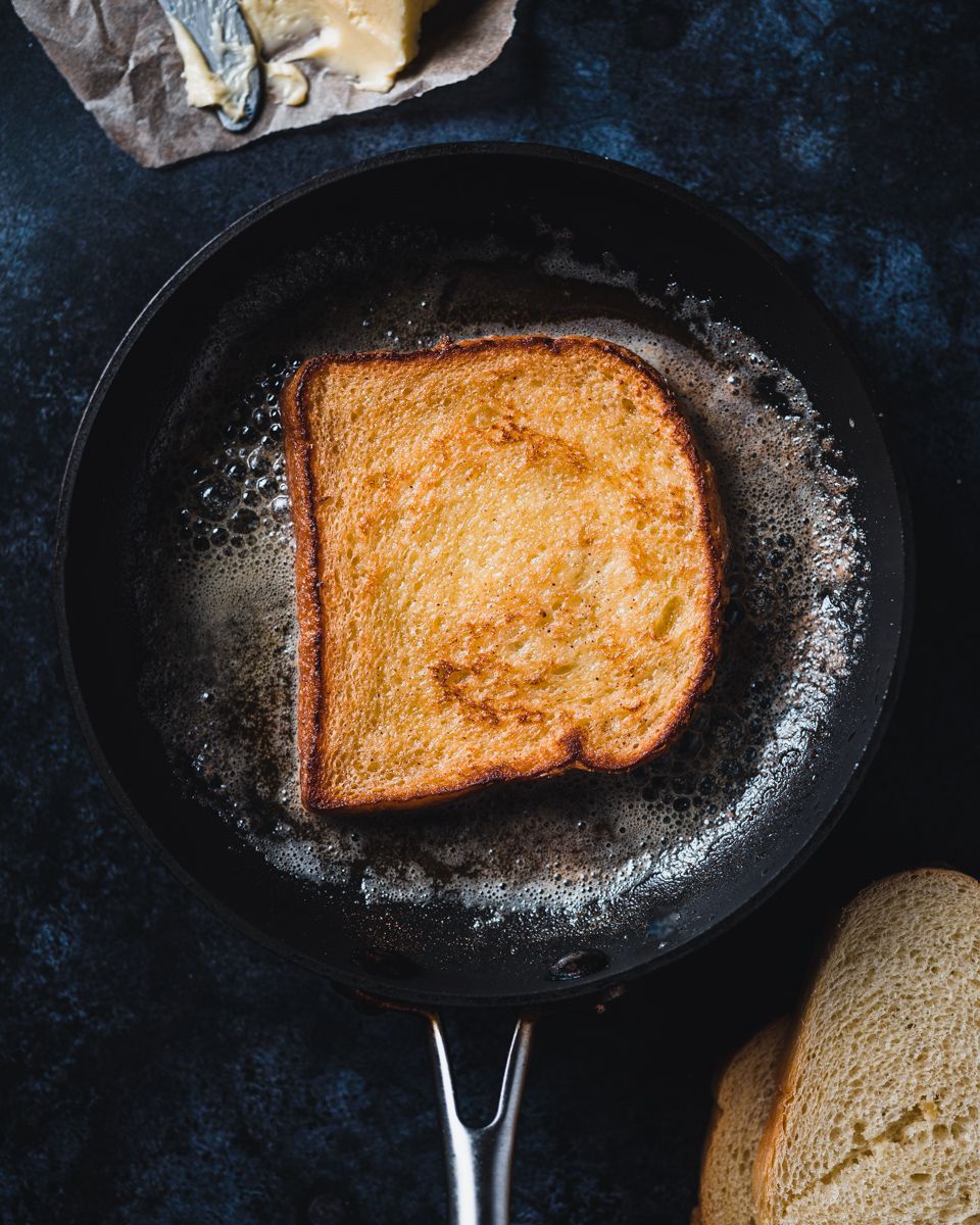 3:Smelt smøret i en stekepanne. Løft opp brødskivene av egge- blandingen og la over- flødig egg renne av. Stek brødskivene i smøret til de er gylne på begge sider. Serveres umiddelbart.