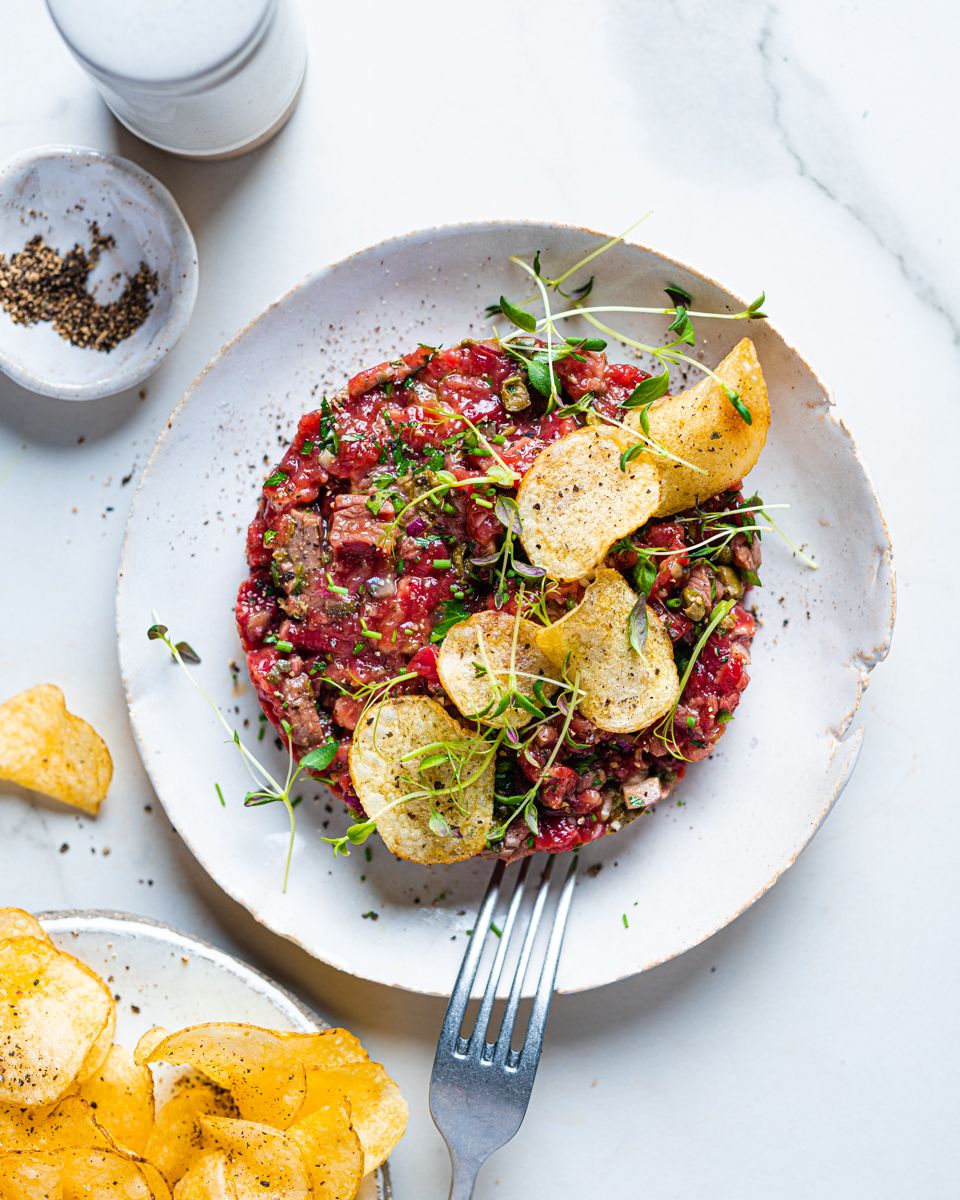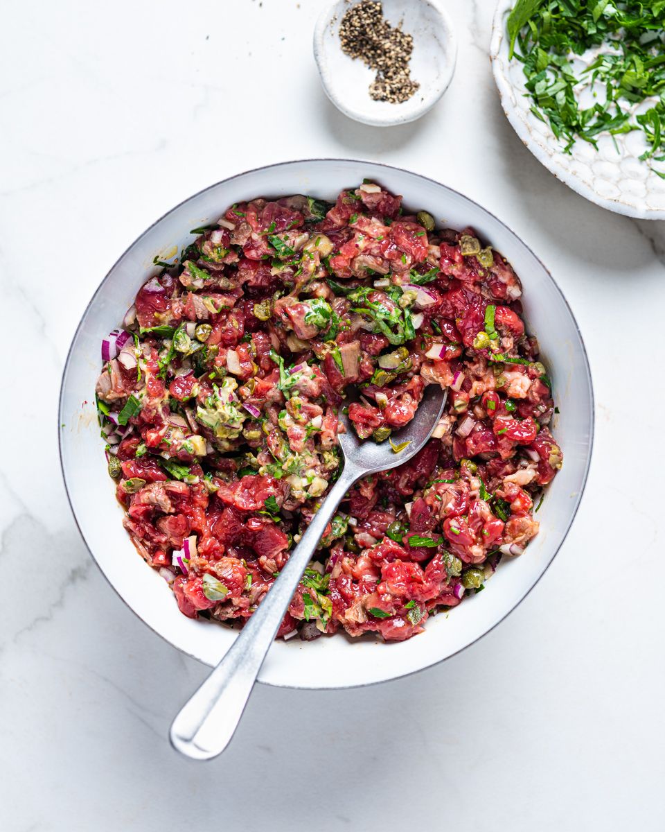 Når du bestiller en klassisk biff tartar på restaurant, serveres ofte kjøttet alene, med kapers, løk og eggeplomme ved siden av. I denne oppskriften har jeg blandet inn alle ingrediensene i kjøttet, noe jeg synes både ser bedre ut og smaker bedre.