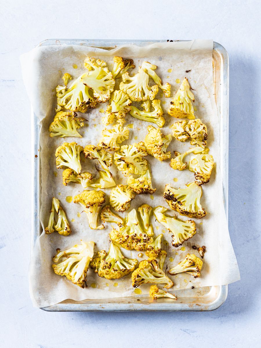 1:Kutt blomkålen i buketter. Legg blomkålbukettene på et stekebrett og vend dem i olivenolje. Stek midt i ovnen ved 200 °C i ca. 25 minutter til blomkålbukettene er gylne og nesten møre.
