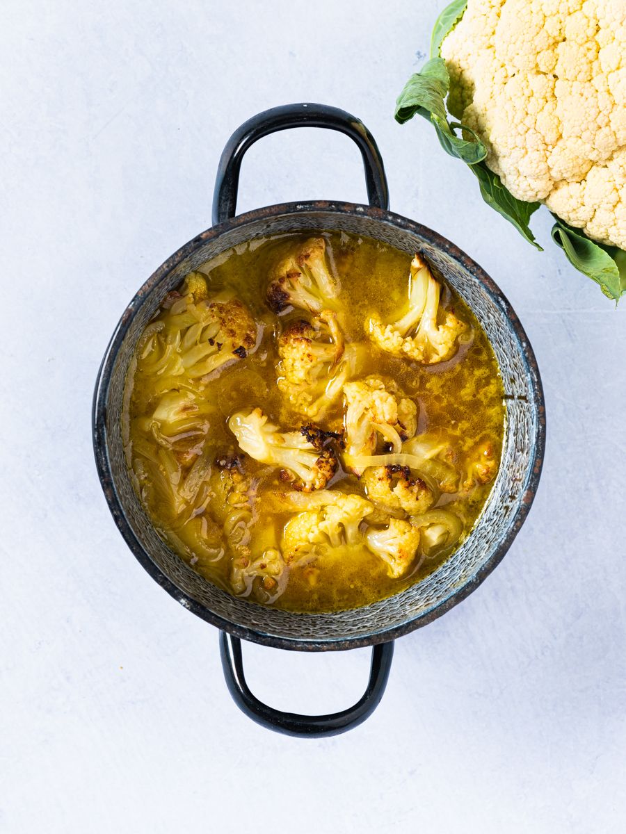 2:Finhakk løk og hvitløk. Ha to tredjedeler av blomkålbukettene i en kjele sammen med løk, hvitløk og 1 ss smør. Stek i 5 minutter under omrøring. Tilsett kraften og la koke i 15–20 minutter til blomkålen er helt mør.