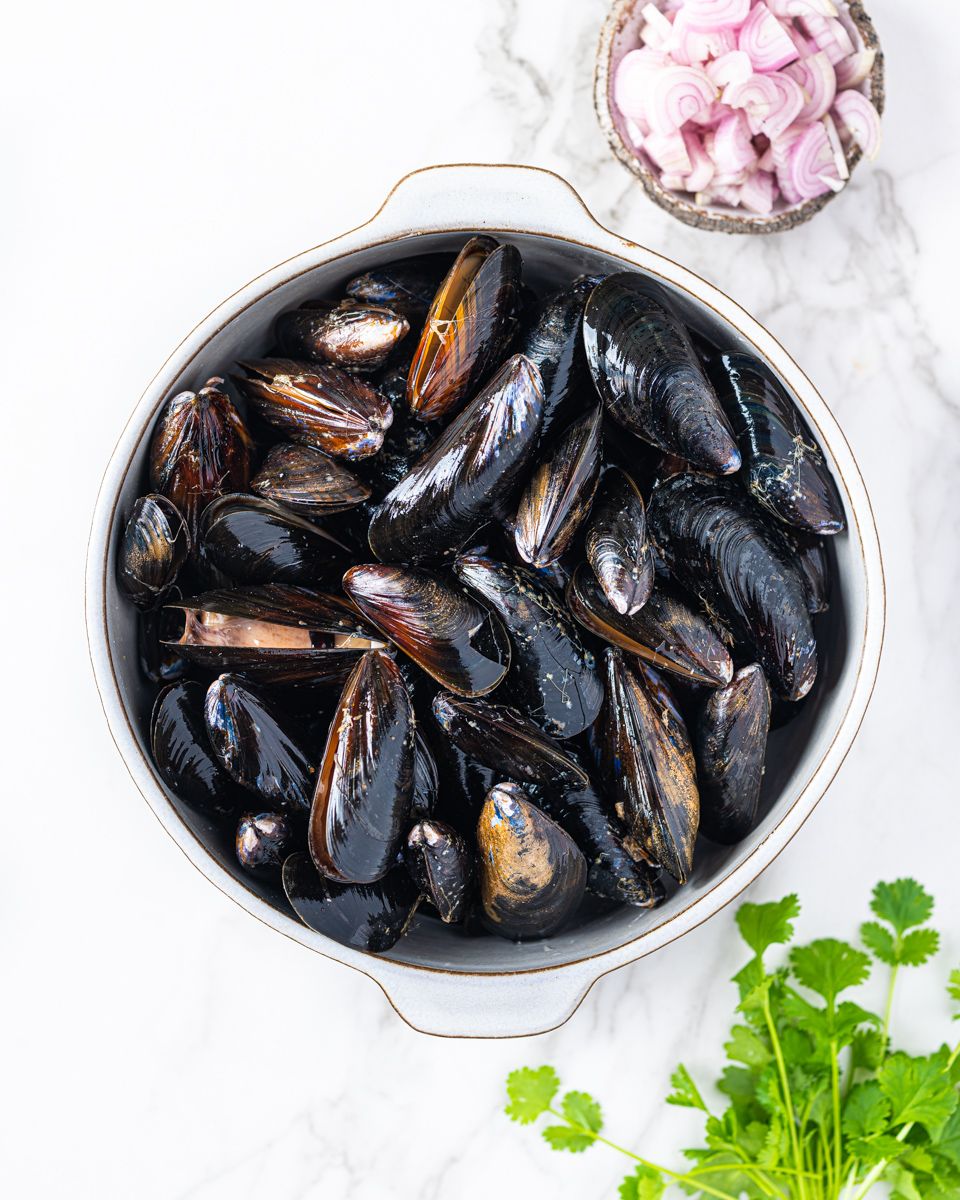 1:Skyll blåskjellene i kaldt vann og fjern blåskjell som ikke lukker seg, eller som er knust. Finhakk sjalottløken og korianderen.