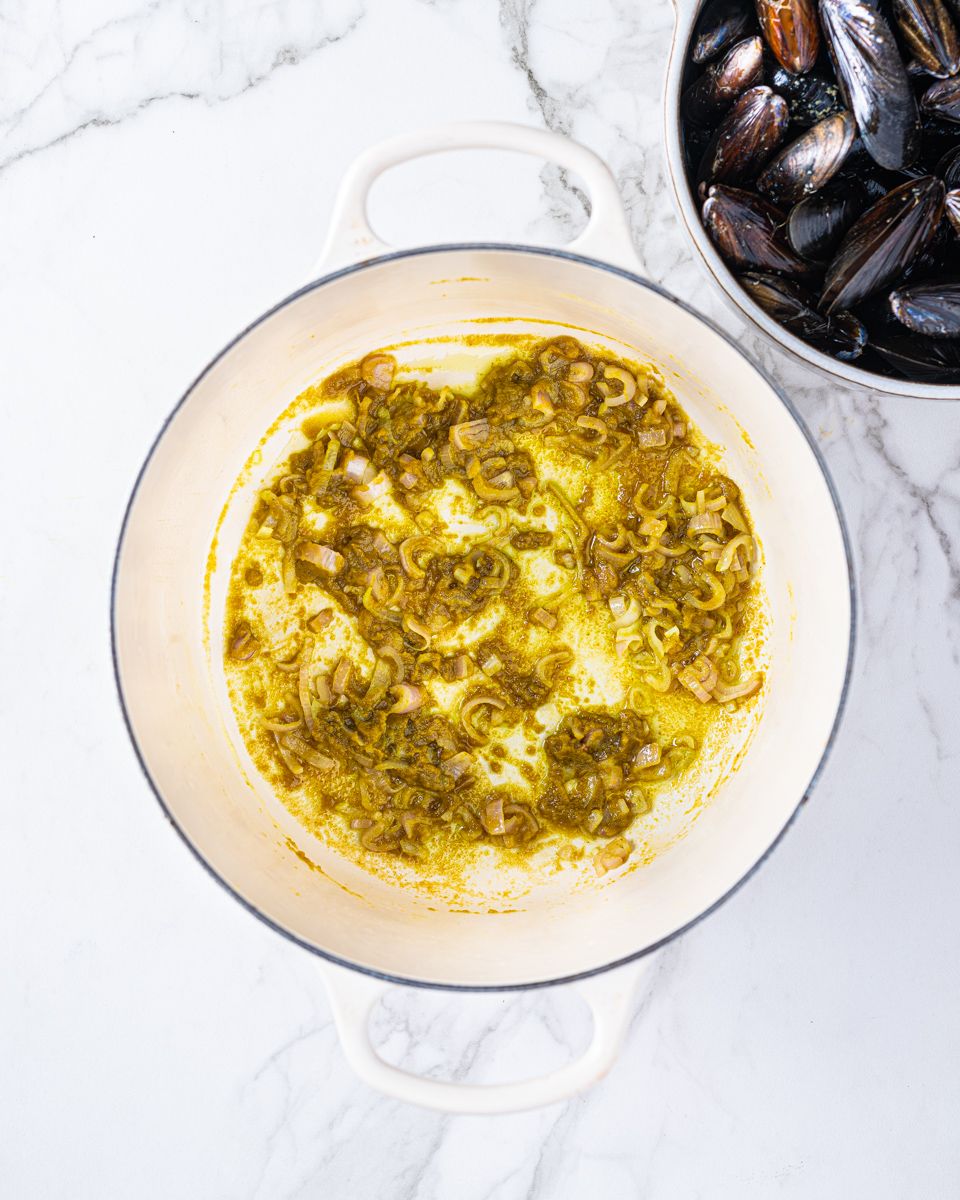 2:Fres sjalottløken i olje i en kjele under omrøring i 1 minutt. Tilsett green curry paste og stek i ytterligere 1 minutt.
