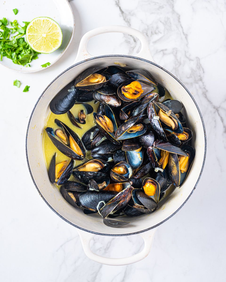 3:Ha blåskjellene og kokosmelken i kjelen. Sett på lokk og la dampe i ca. 3 minutter til blåskjellene åpner seg. Hold på lokket og rist lett på kjelen halvveis. Press over limesaft og strø over koriander før servering.