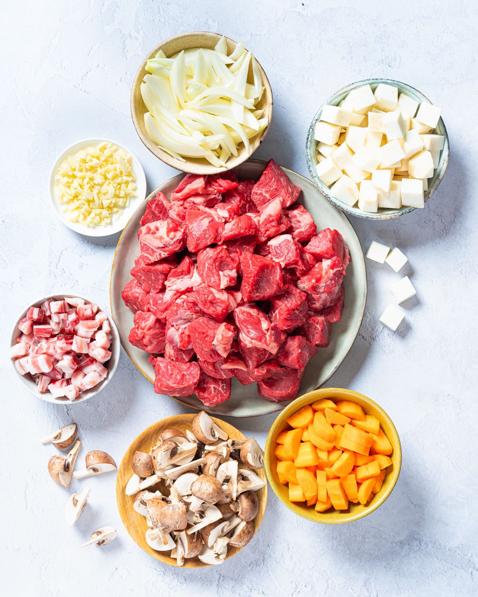 1:Kutt høyryggen i ca. 3 x 3 cm store terninger. Skrell gulrøtter, gul løk og sellerirot. Kutt gulrøttene i to på langs og så i biter. Kutt løken i båter. Kutt selleriroten i ca. 2 x 2 cm terninger. Finhakk hvitløken. Kutt baconet i terninger. Del soppen i grove biter. Skrell småløken.