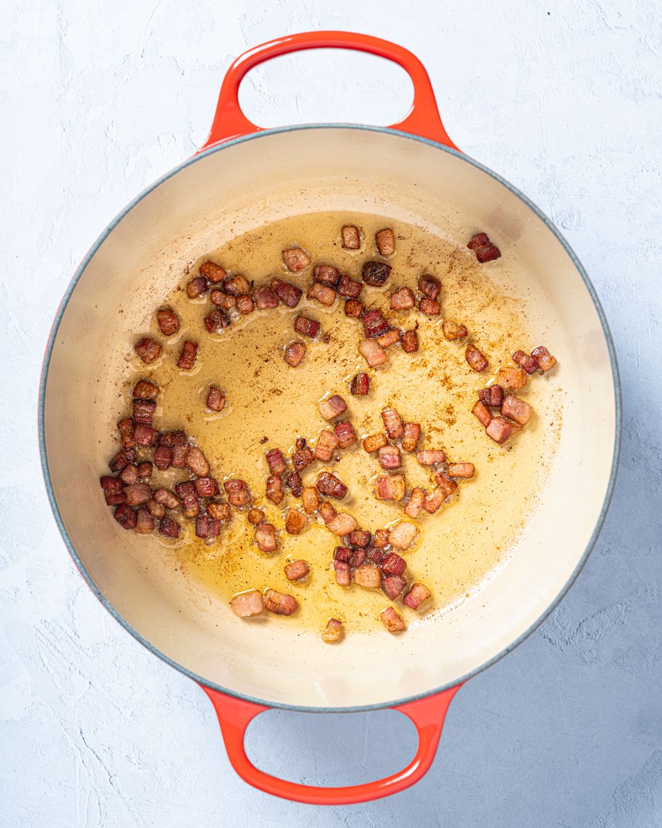 2:Brun baconet i olivenolje i en stor gryte til det er gyllent. Du skal lage hele boeuf bourguignonen i denne gryta, pass på at den er stor nok. Løft baconet ut av gryta og legg det på et fat.