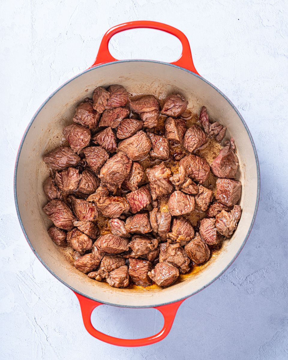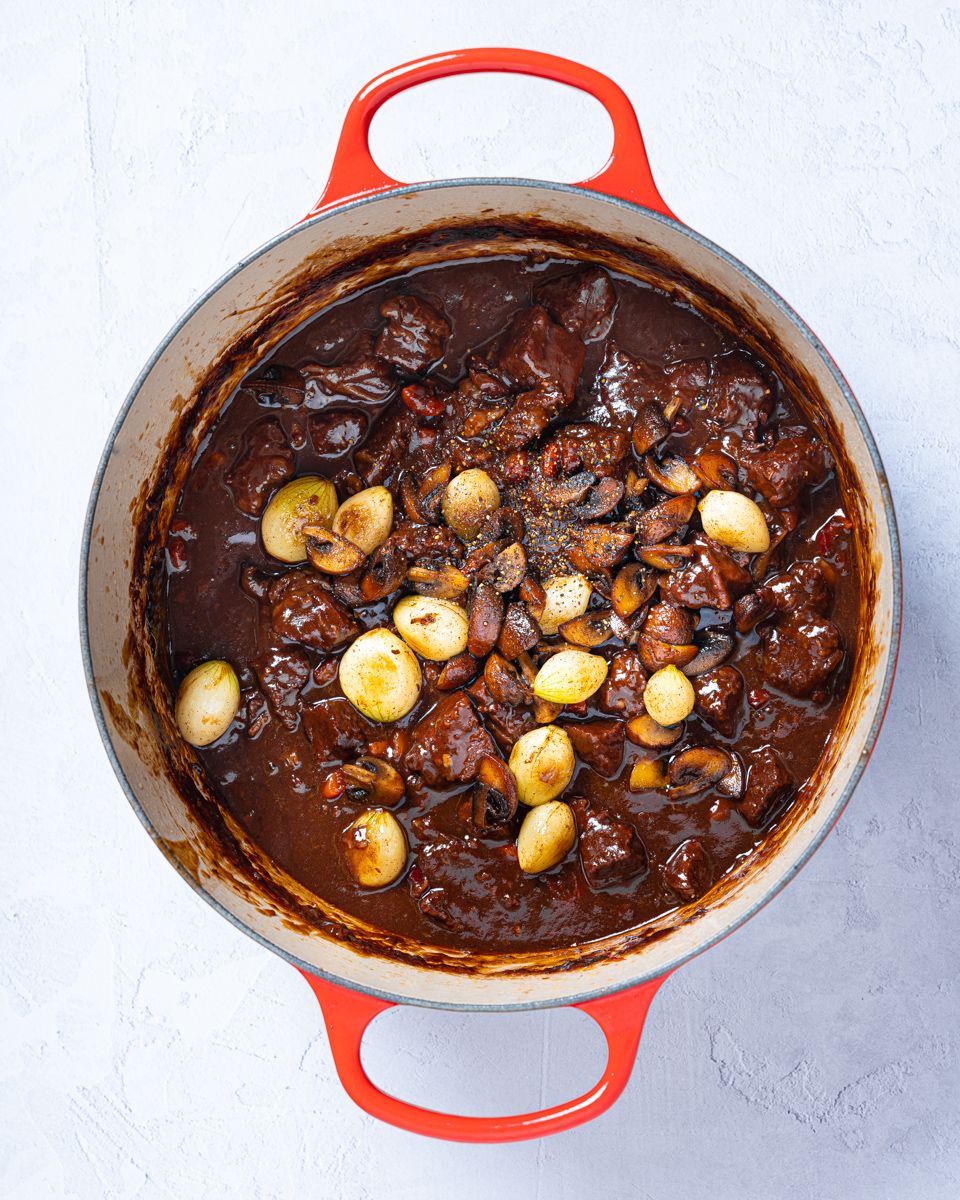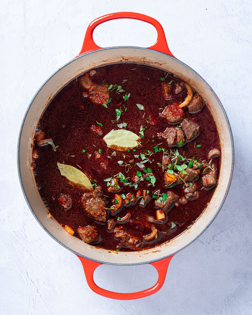 6:Ha rødvin, kraft, timian og laurbærblad i gryta. La koke i 2–3 timer til kjøttet er helt mørt. Pass på å røre av og til, slik at kjøttbitene ikke brenner seg fast i bunnen. Ettersom gryta skal koke lenge, må du passe på at den ikke koker helt tørr. Fyll på litt ekstra vann eller oksekraft hvis all væsken koker bort mot slutten.