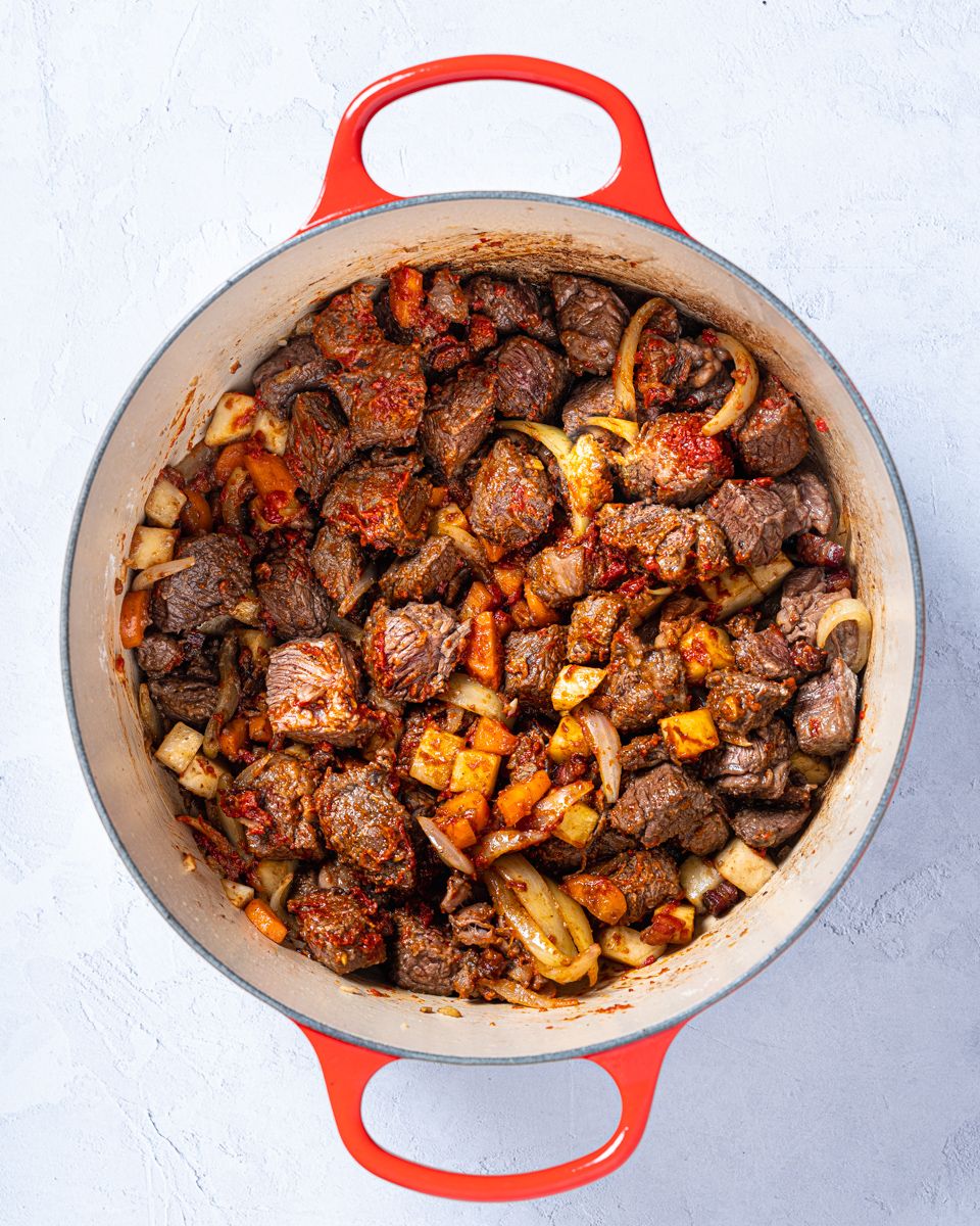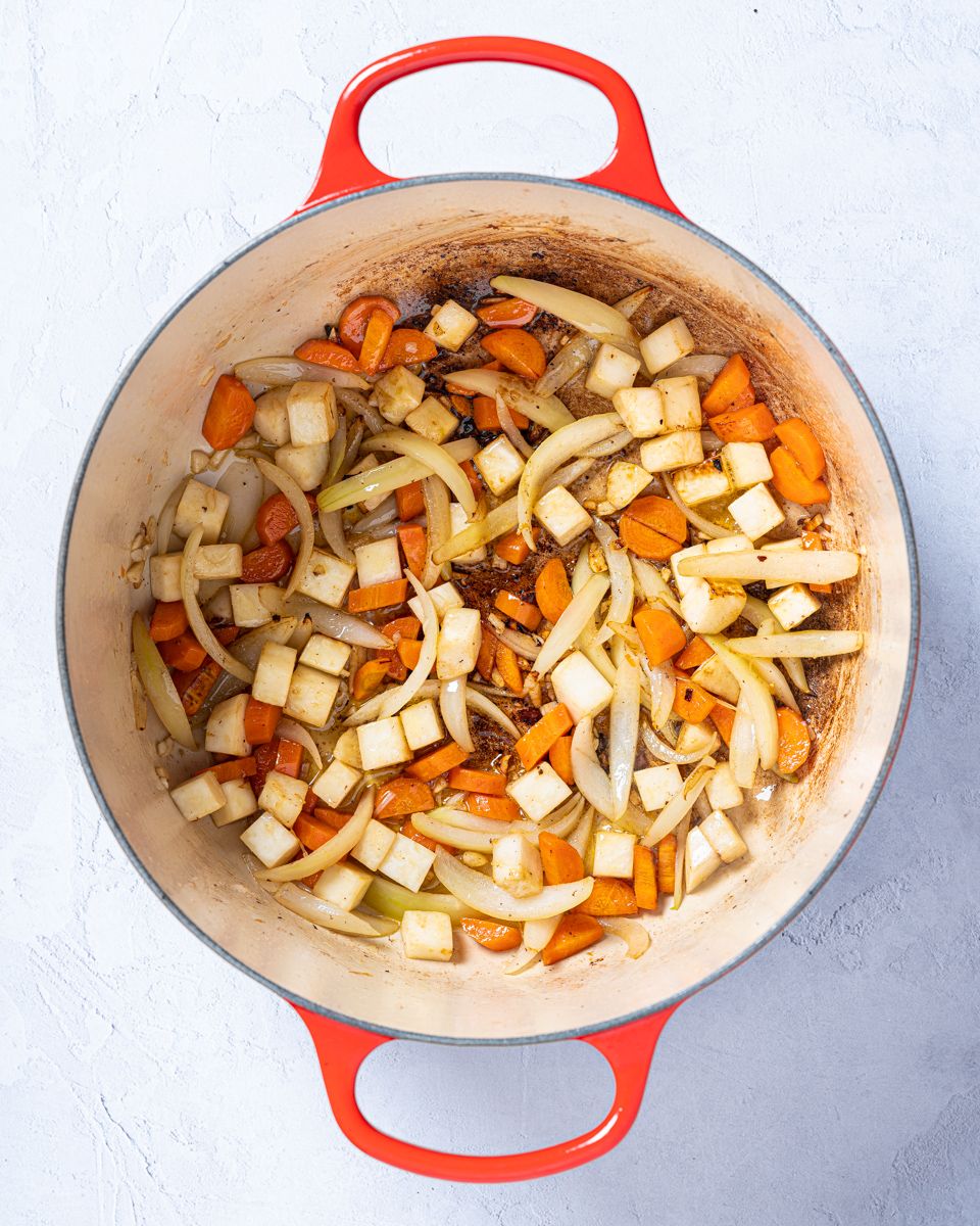 4:Ha gulrøtter, gul løk, hvitløk og sellerirot i gryta og stek under omrøring til grønnsakene har fått litt farge.