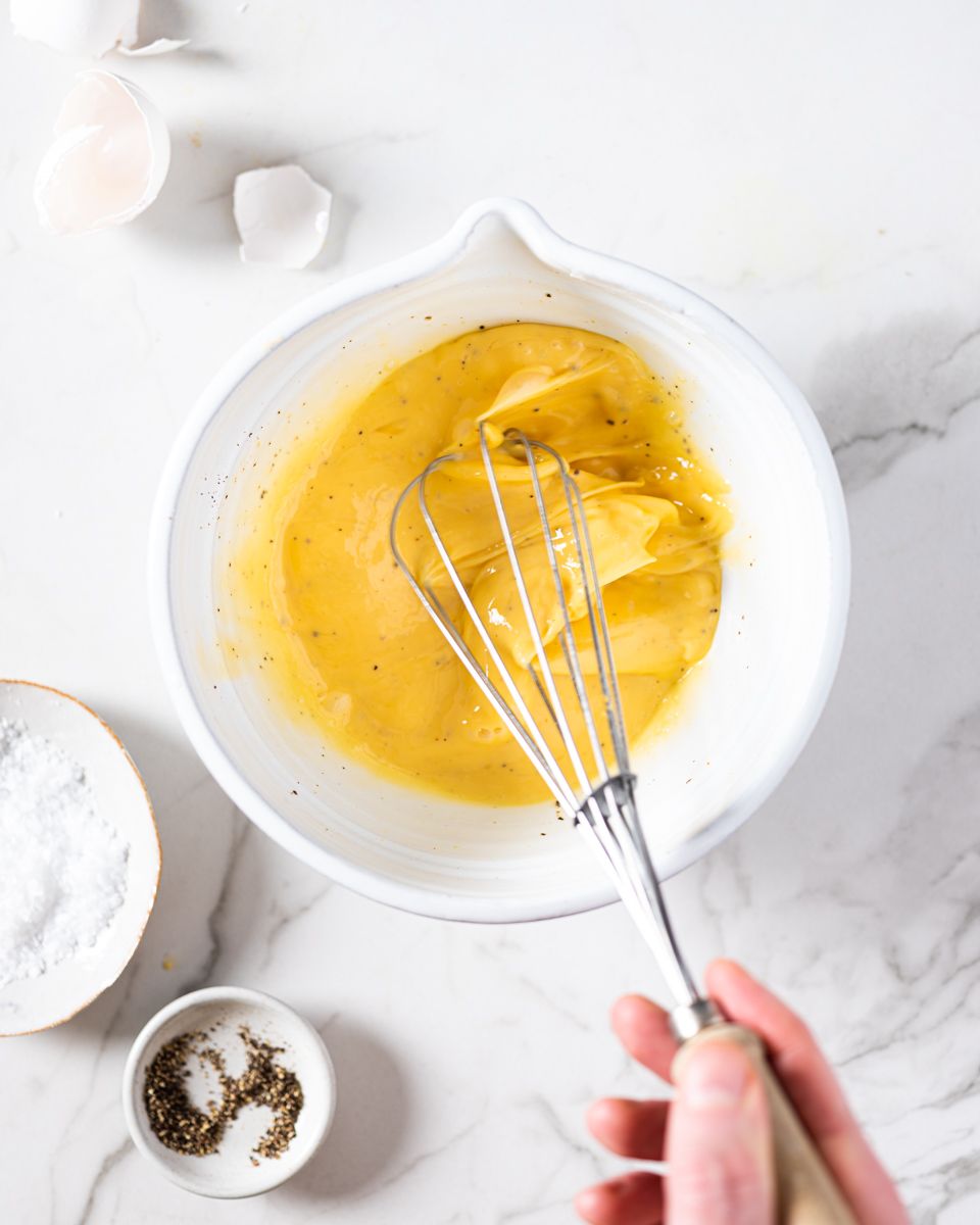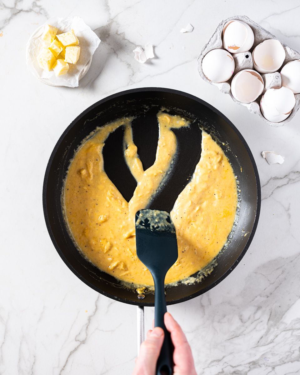 1:Pisk sammen egg, fløte, salt og pepper i en bolle. Pisk i 1 minutt med en gaffel til eggene er godt blandet og du får litt luft inn i blandingen. Smelt smøret i en nonstick stekepanne på litt under medium varme. Ha eggene i stekepanna og dra inn eggeblandingen fra ytter- kanten og inn mot midten med en slikkepott.