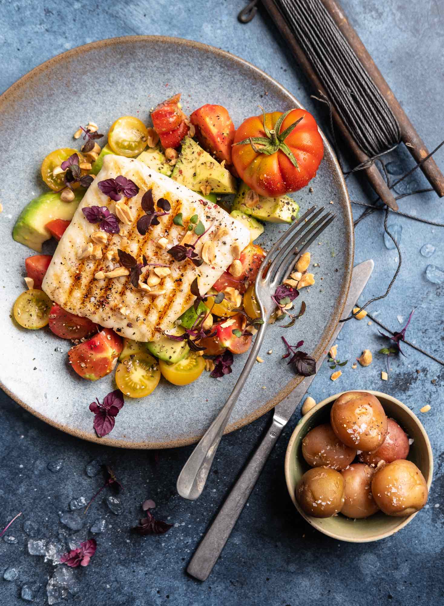 Nyt retten slik den er, eller server med bakte poteter hvis du ønsker en mer mettende rett. Potetene lager du enkelt ved å pakke dem i aluminiumsfolie sammen med olivenolje, salt, pepper og finhakkede urter. Legg aluminiumspakken på indirekte varme i ca 45 minutter til potetene er møre. Dette bør du eventuelt gjøre før du begynner med tomatsalaten og fisken.