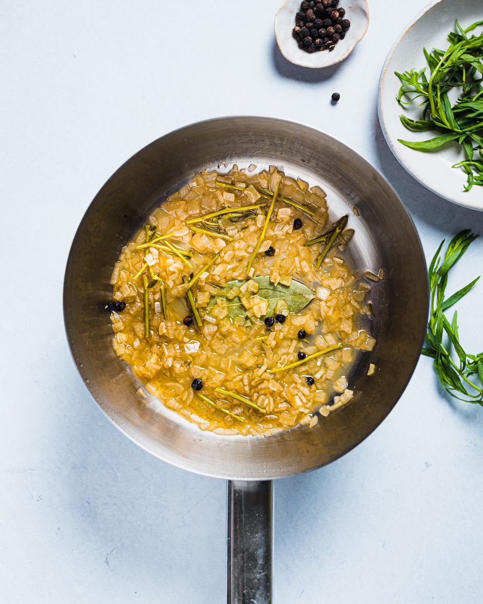 1:Start med å lage en reduksjon. Plukk bladene av estragonstilkene. Ta vare på bladene. Grov- hakk stilkene og sjalott- løken og ha dem i en kjele sammen med laurbær- bladet, pepperkornene og eddiken. La koke til det gjenstår ca. 2 ss av eddiken. Sil blandingen og ta vare på den smaksatte eddiken. Dette er reduksjonen og utgangspunktet for béarnaisesausen.