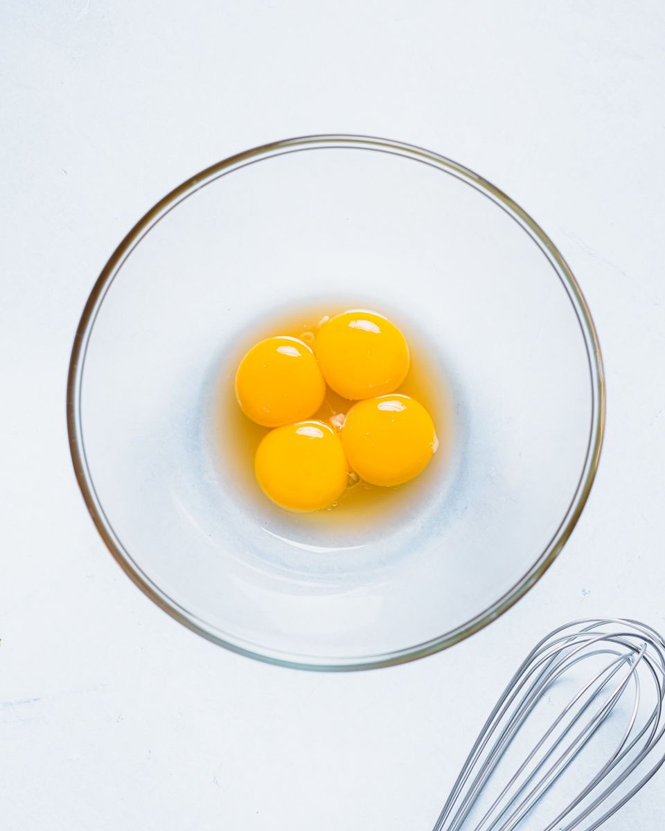 3:Sett bollen over kjelen med vann. Pass på at bollen ikke berører vannet. Pisk med en visp til eggene begynner å bli luftige og litt lysere i fargen. Dette tar ca. 3 minutter.