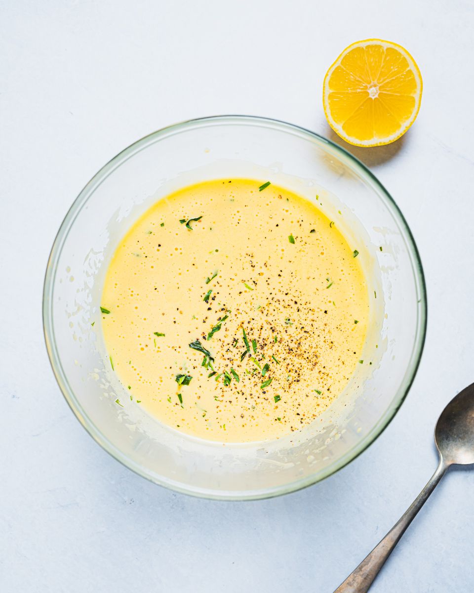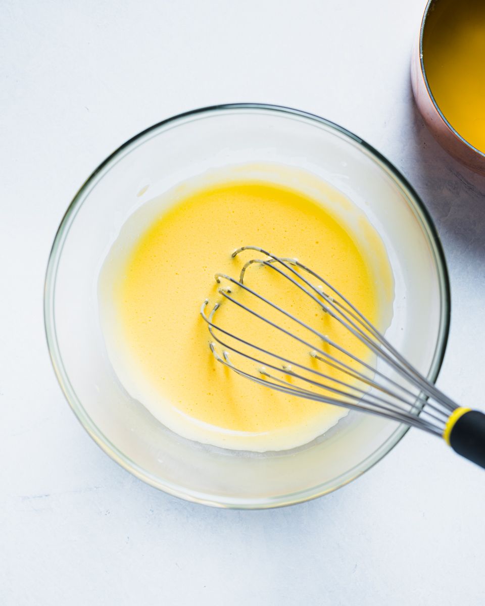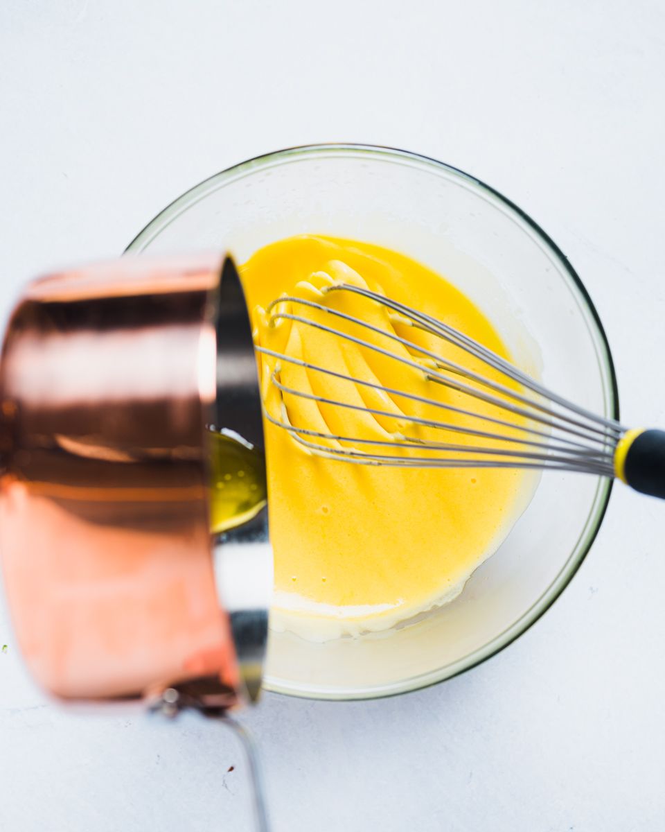 4:Skru av varmen og hell i litt og litt av det klarede smøret mens du fortsetter å piske. Fortsett å spe forsiktig til alt smøret er tilsatt. Du skal da ha en kremet og fløyelsmyk saus. Hvis sausen blir for tykk, kan du tilsette litt kaldt vann. Mål temperaturen underveis, og pass på at sausen aldri blir på over 65 °C, for da vil den fort skille seg.