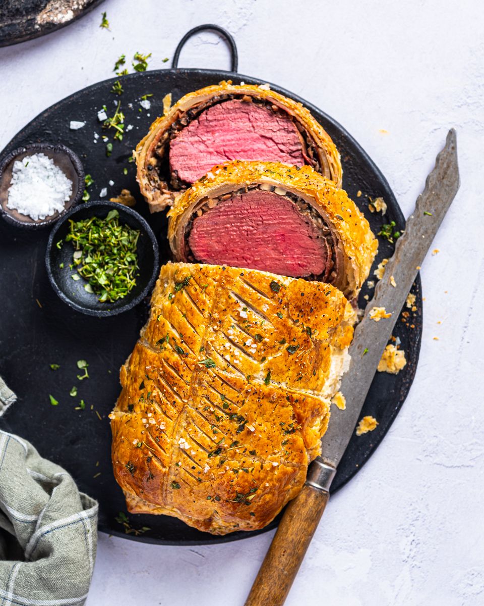 Løft Beef Wellingtonen over på en rist og la den hvile i 15 minutter før den skjæres i skiver og serveres. Skjær forsiktig, slik at butterdeigen ikke faller av når du skjærer i den.