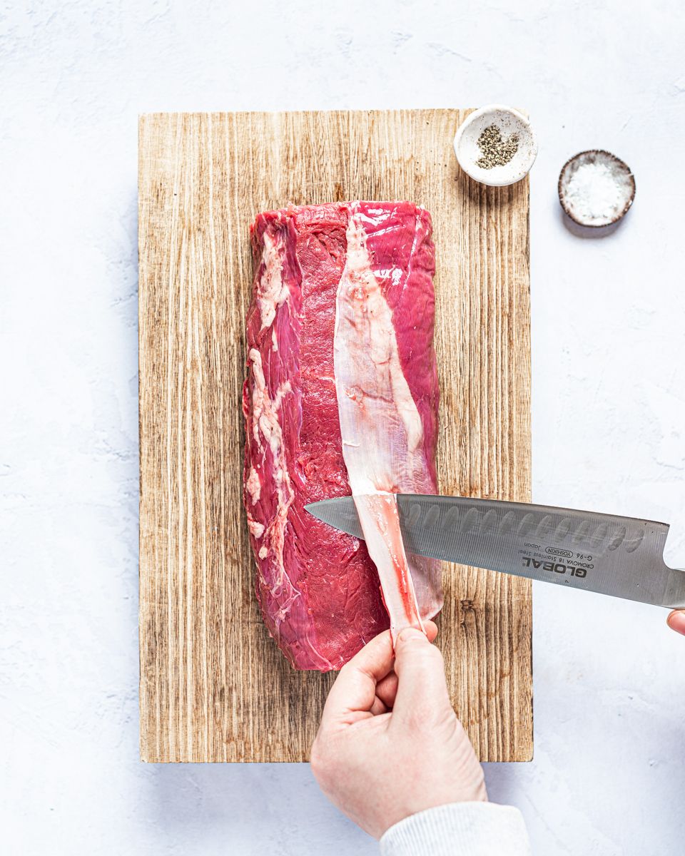 2:Renskjær indrefileten. Bruk helst midtstykket som har jevn størrelse. Skjær av sener.