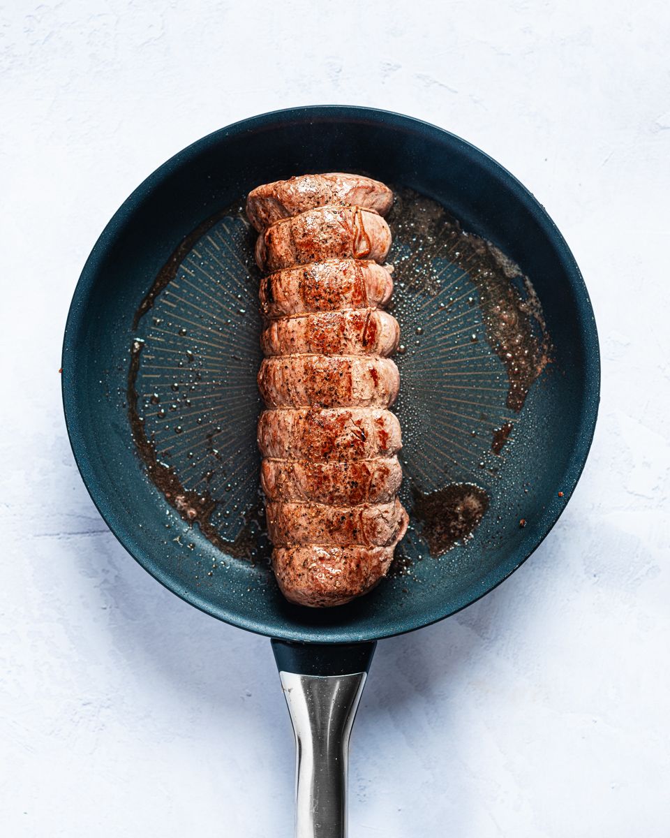 3:Krydre indrefileten med salt og pepper. Brun indrefileten i 1 ss smør i stekepanna til den er gyllen rundt det hele. Hvis indrefileten er litt ujevn, kan du surre den med bomullstråd før du bruner den. Pakk indre- fileten tett i plastfolie og legg den i kjøleskapet til den er helt kald. Stram plastfolien slik at du får en så jevn og fin rull som mulig.