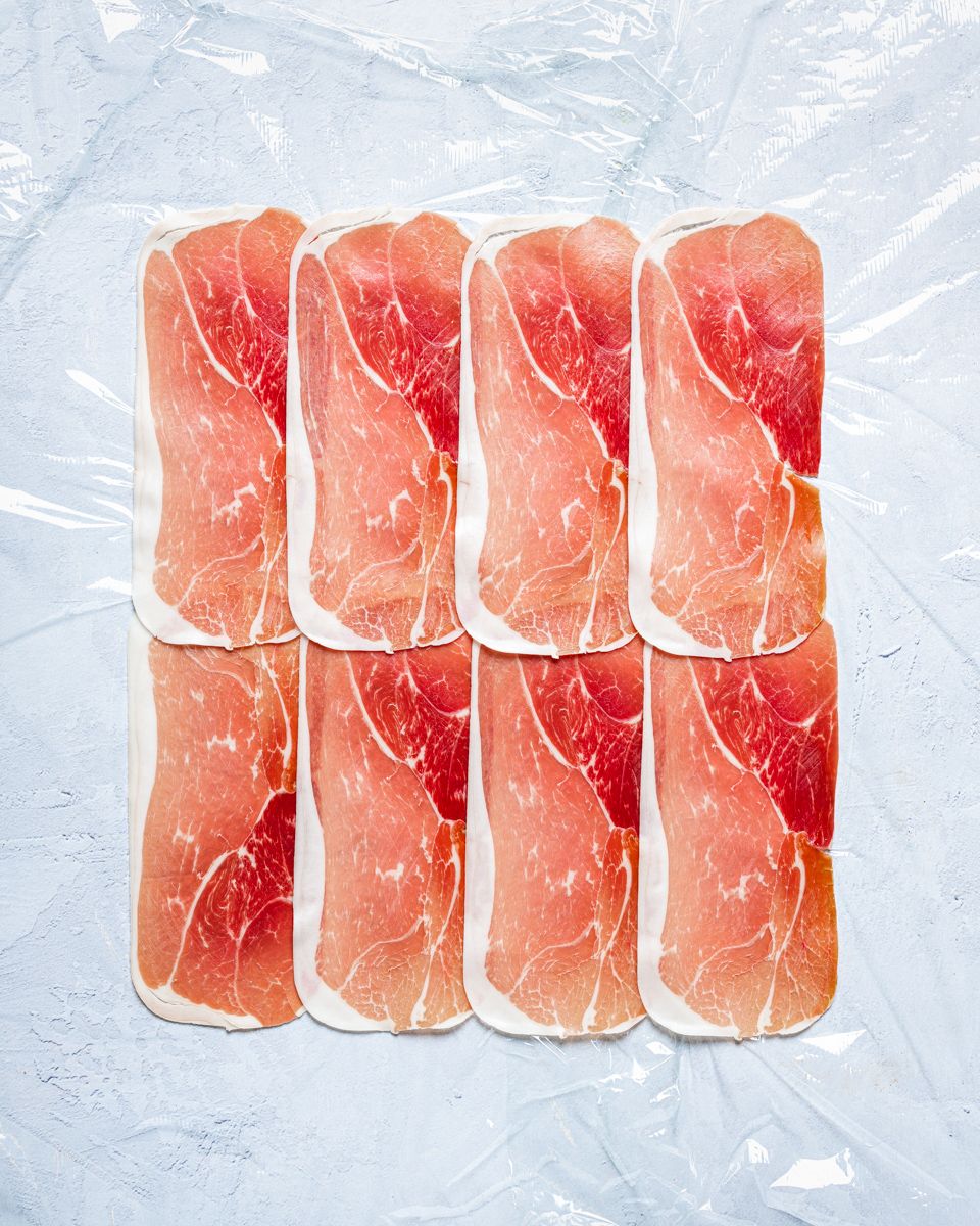 4:Legg plastfolie på benken. Legg spekeskinkeskivene utover plastfolien. Pass på at du dekker et område stort nok til å surre rundt hele indrefileten.