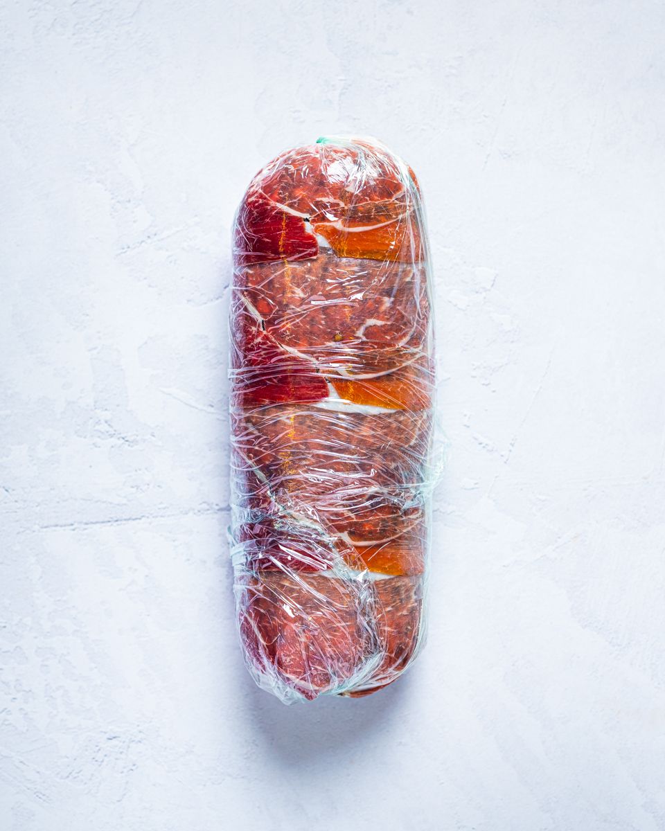 6:Snurr sammen plastfolien i hver ende, slik at du får en stram «pølse». Legg indrefileten i kjøleskapet i minst 1 time. Du kan gjerne forberede så langt dagen før den skal serveres, da får indrefileten satt seg ordentlig.