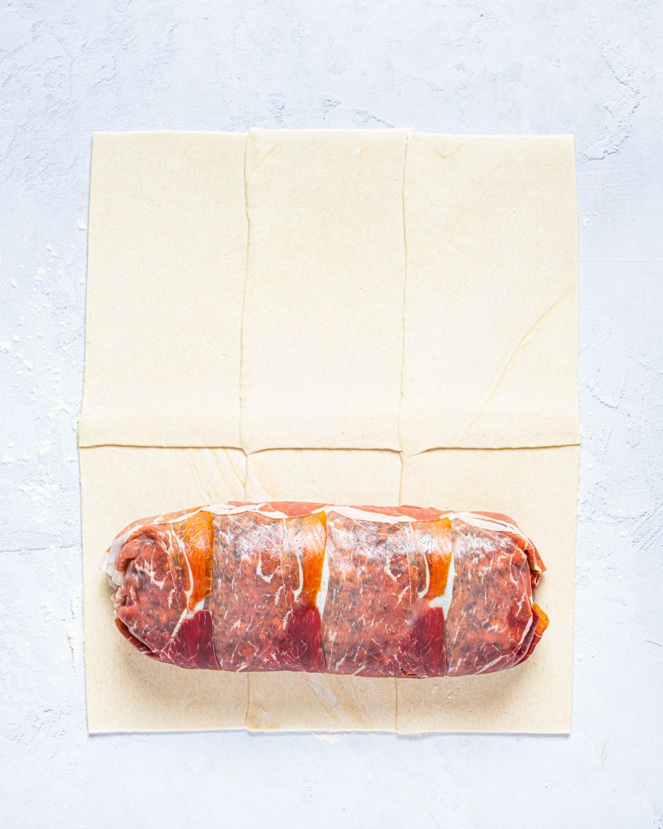 7:Strø litt mel på kjøkkenbenken. Legg butterdeigsplatene ved siden av hverandre på benken. Hvis de er store nok til å dekke rundt hele indrefileten, trenger du bare å skjøte dem sammen. Hvis de er for små, kan du la dem overskjøte hverandre og kjevle dem ut til platen er stor nok til å dekke indrefileten. Pisk sammen egget og lim skjøtene med det. Ta plastfolien av indrefileten og legg den på enden av butterdeigen.