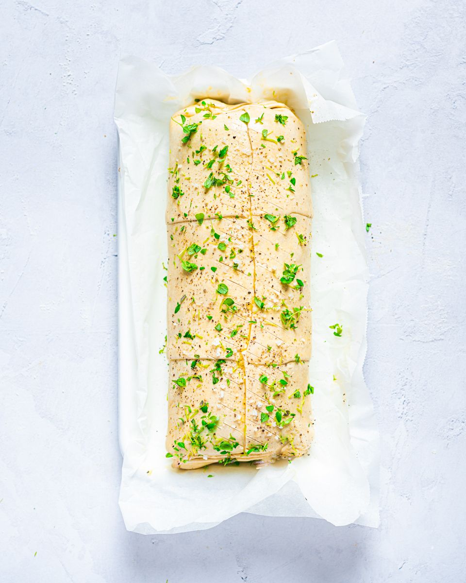 8:Rull butterdeigen rundt indrefileten til den er fast rundt hele. Pensle skjøtene med egg og klem dem sammen. Legg indrefileten på et stekebrett med bakepapir med den største skjøten ned. Pensle butterdeigen med sammenpisket egg. Hvis du vil ha et mønster, kan du lime på strimler av butterdeig med sammenpisket egg. Eller du kan skjære små snitt med en skarp kniv. Strø over litt salt, pepper og finhakket timian.