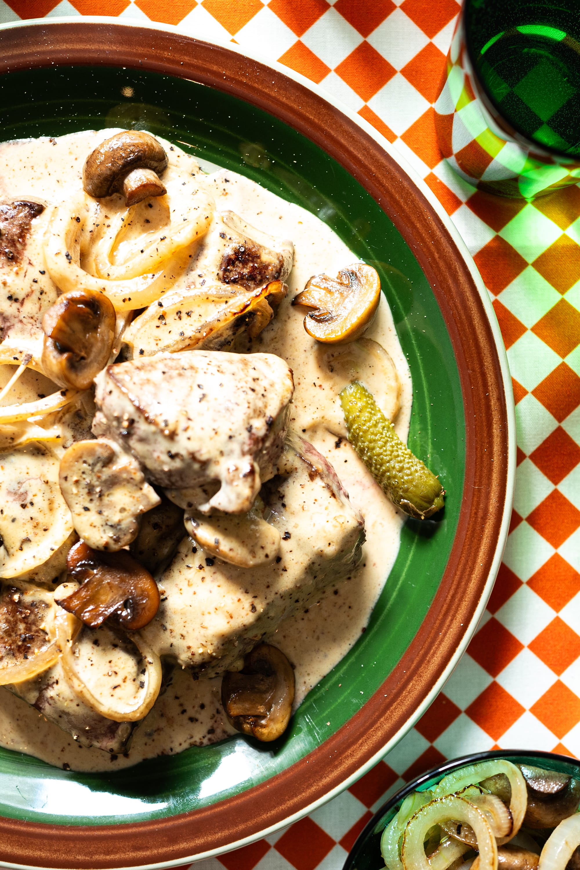 Stek løk og sopp i stekepanna til de er gylne. Ha leveren tilbake i panna sammen med einerbær, sennep og fløte. La koke i noen minutter til fløten tykner. Du kan også jevne den med litt maizenna.