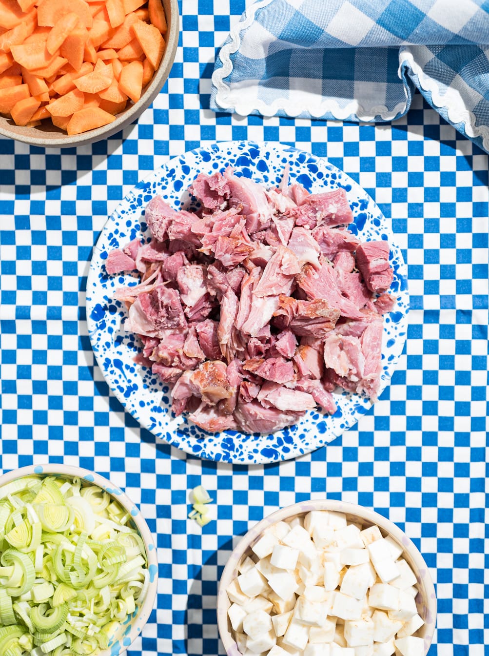Mens grønnsakene koker i trykkokeren kan du rense svineknoka. Bruk hendene og plukk av bein og fett slik at du sitter igjen med rent kjøtt. Del kjøttet i grove biter.