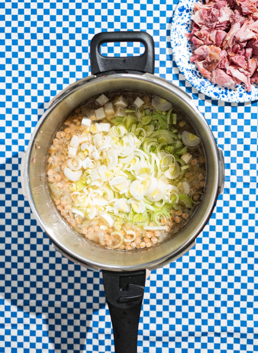 Når sikkerhetsventilen har trukket seg tilbake åpner du trykkokerne og tilsetter byggryn, gulrøtter, purreløk og løk. Sett på lokket og kok opp. La koke i 15 minutter på lavt trykk.
