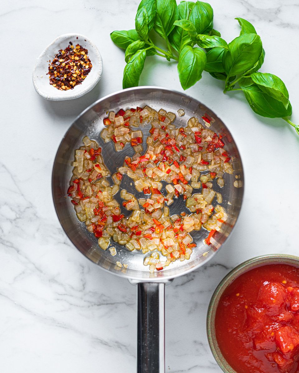 1:Skrell og finhakk hvitløk og løk. Fjern frøene på chilien og finhakk den. Stek hvitløk, løk og chili i olivenolje i en kjele under omrøring på medium varme i 5 minutter.