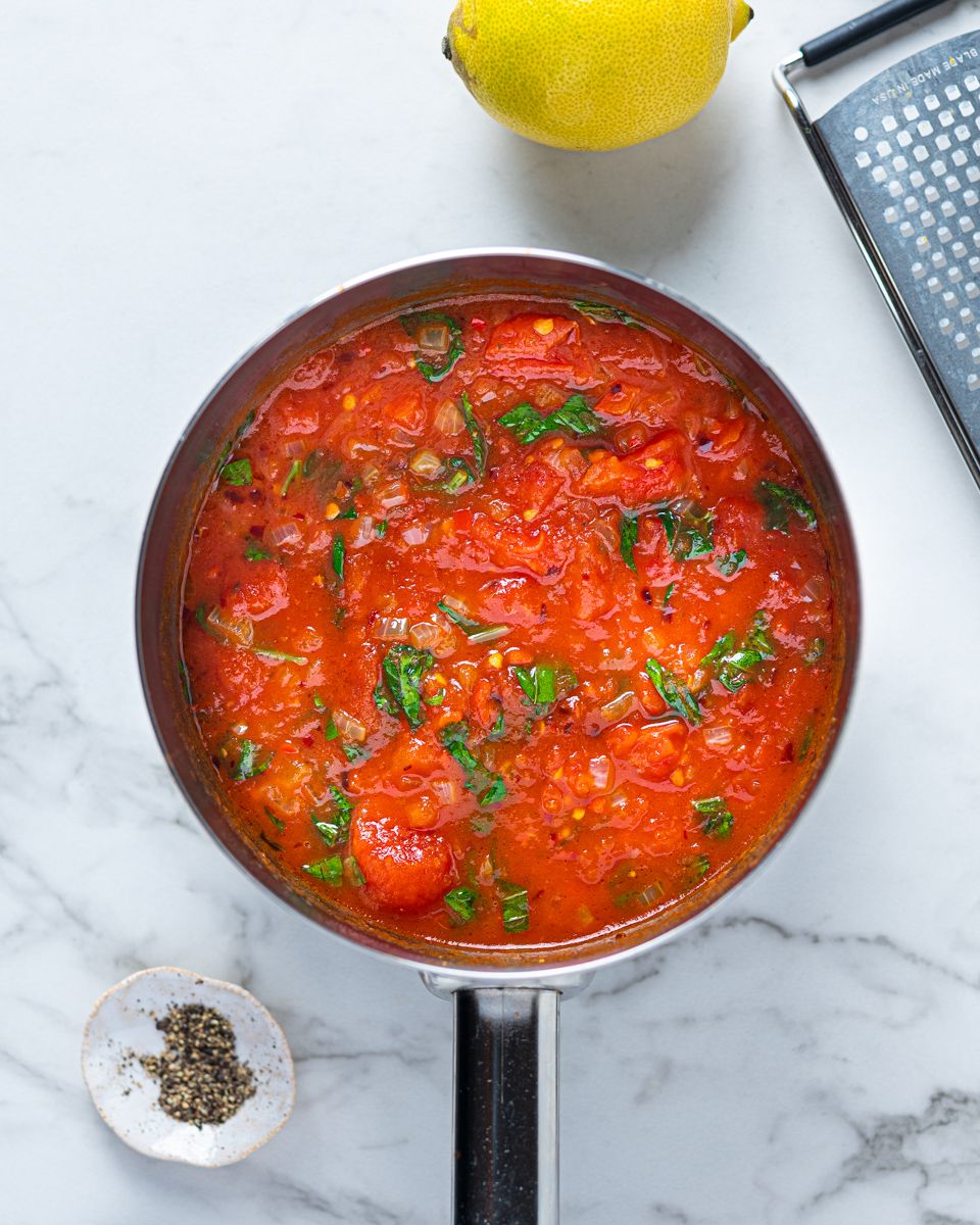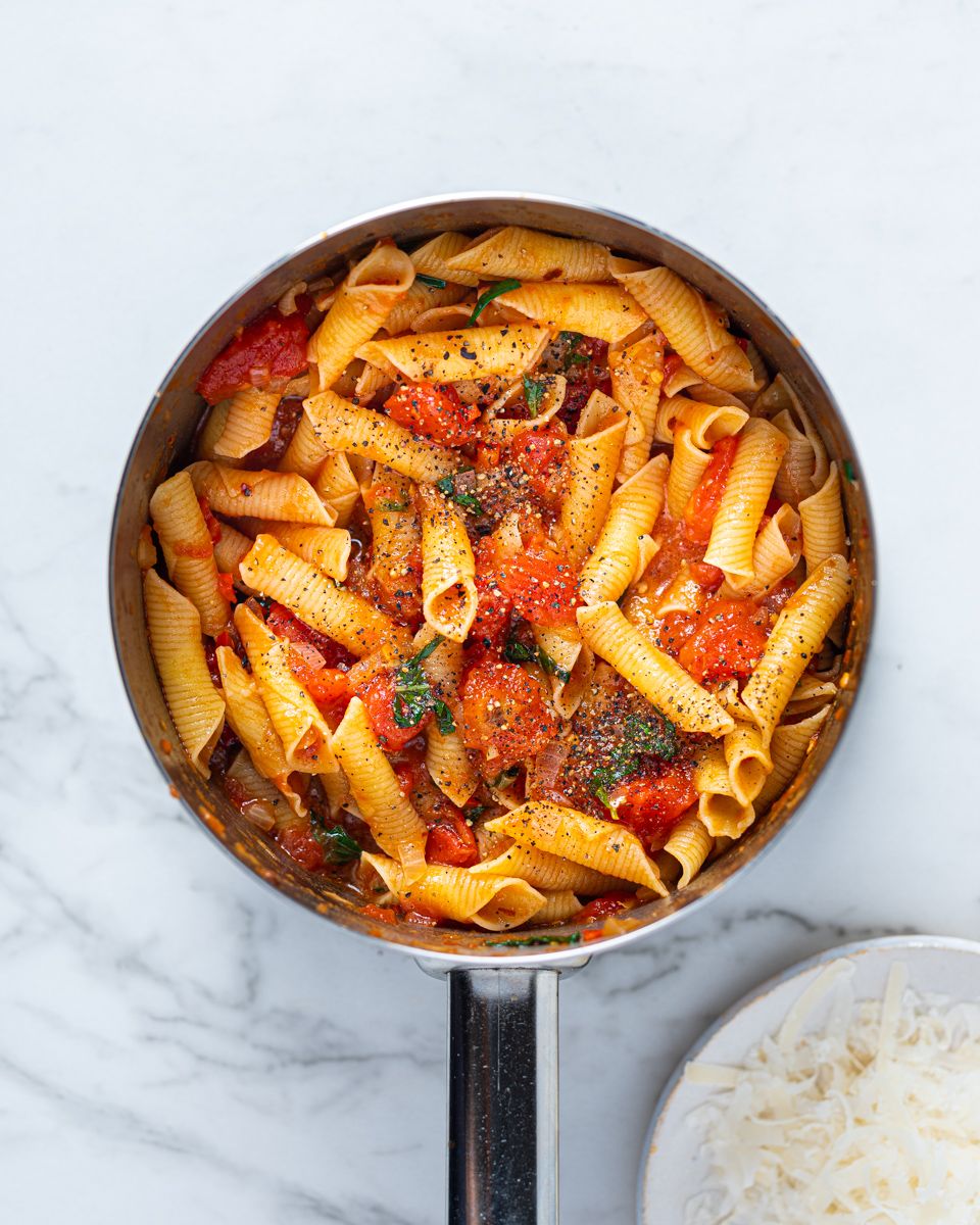 3:Kok pastaen og vend den inn i tomatsausen. Riv over parmesan før servering.