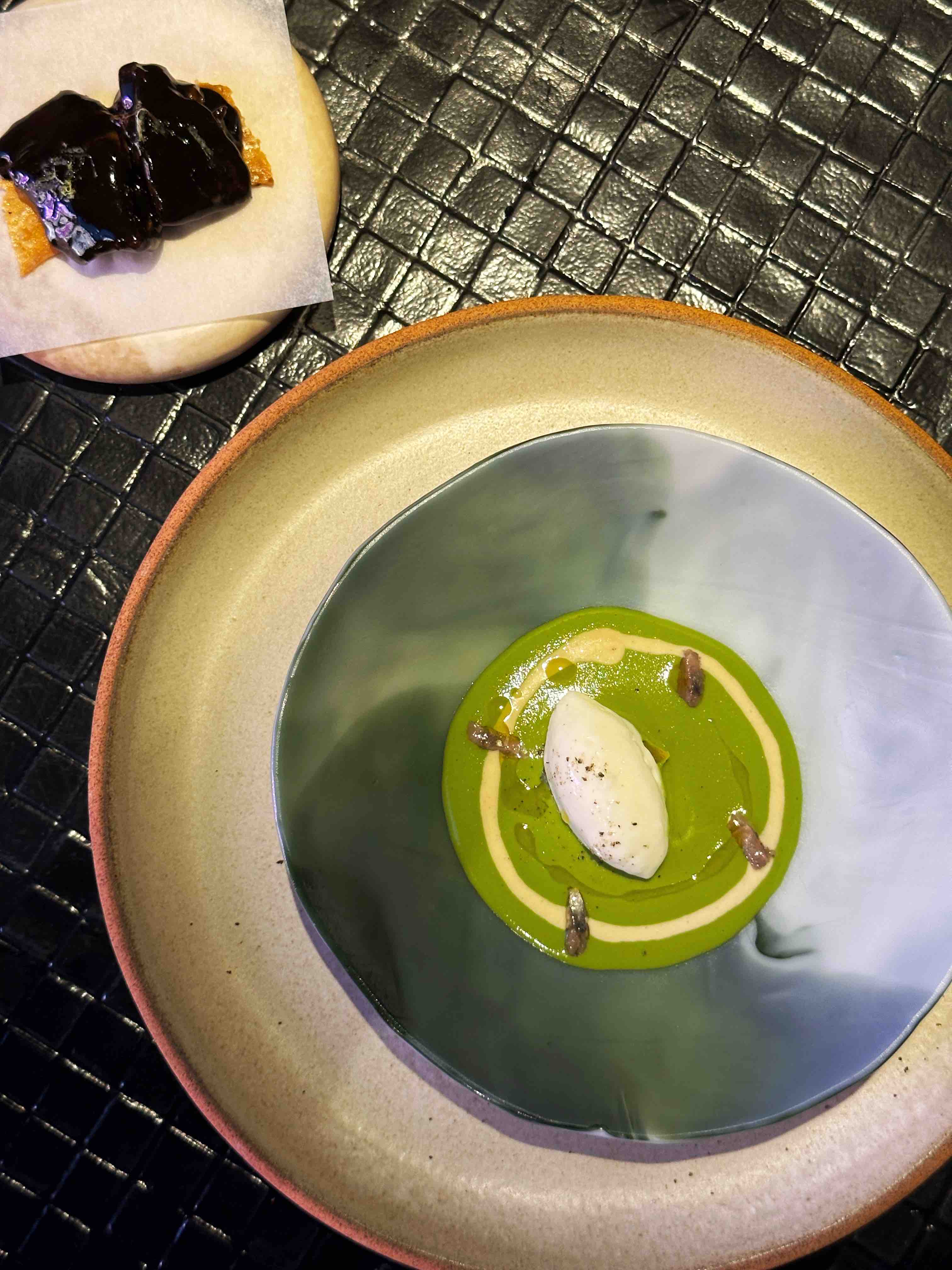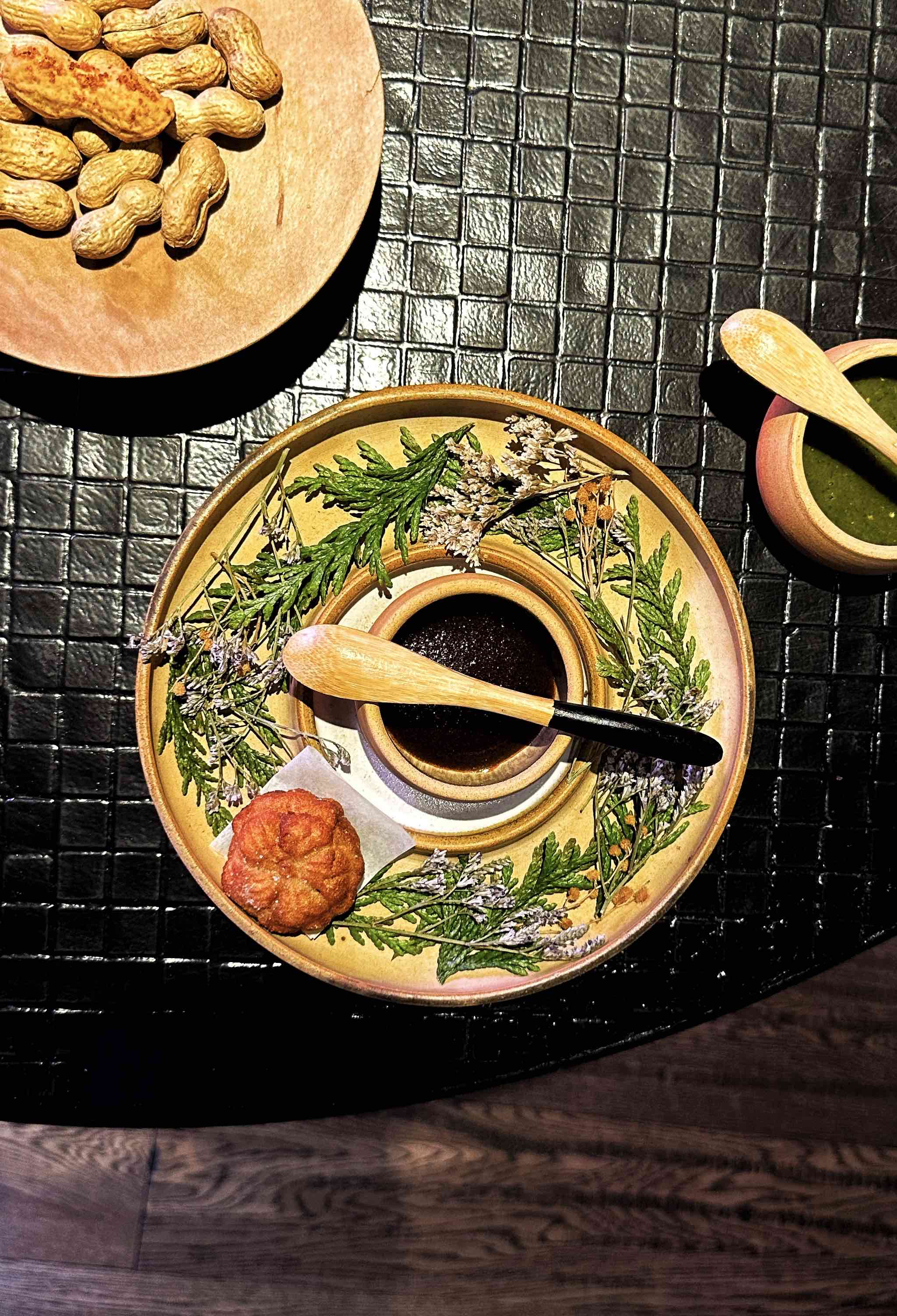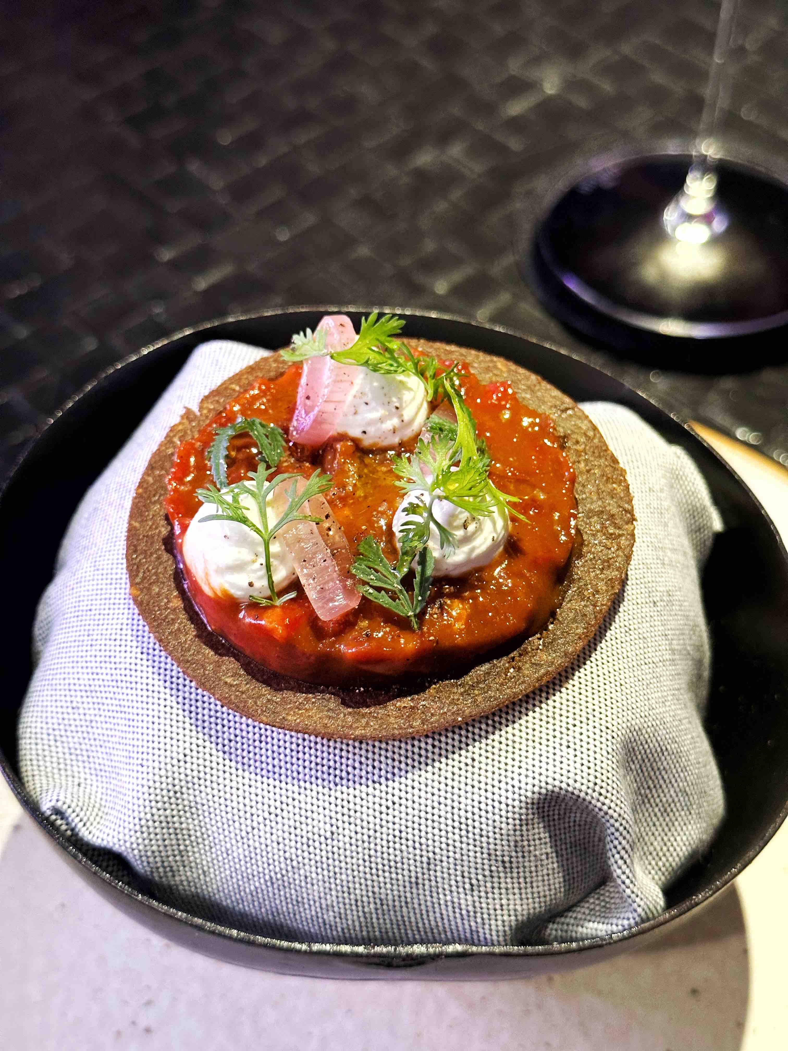 Lunsjen starter med et bord fylt med små appetittvekkere og forretter. De er vakre og elegante små kunstverk. Forskjellen fra mange stjernerestauranter er at her smaker appetittvekkerne masse. Her er det sinnsykt luftig rødbetmarengs med kokoskrem og kaviar, Wagyu tartar på tostada, ceviche, nybakt brioche med tre forskjellige stykningsdeler av svin og tequila fryst ned i flytende nitrogen ved bordet.