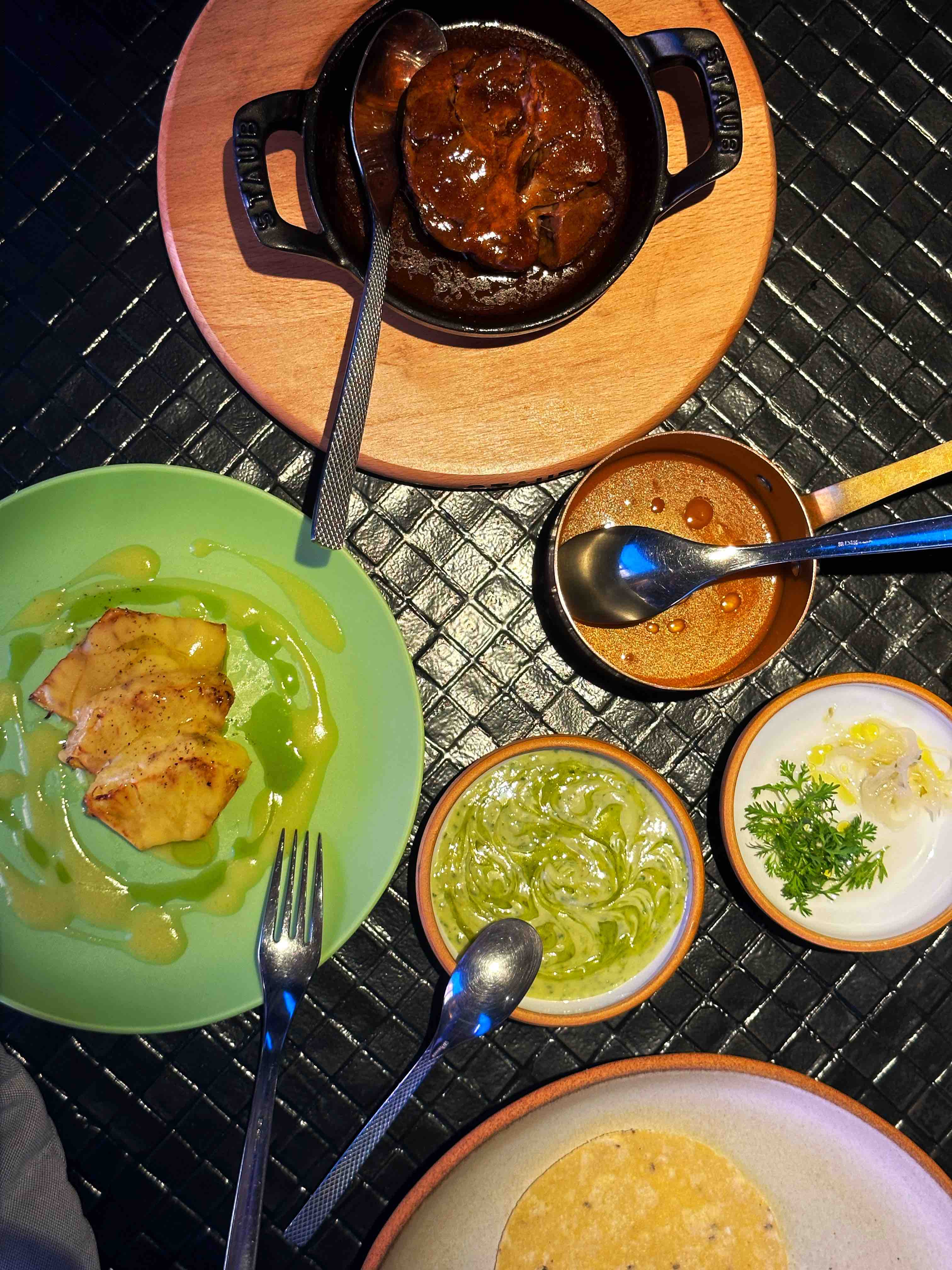 Så kommer dagens hovedrett - Iberico svin "Al Pastor". Et lite tacobord med godsaker som jeg fyller i egne små tacolefser. Langtidsbakt svinenakke, ananas bakt i sin egen juice, jalapeno- og korianderrømme, syltet løk og chilisaus. Dette er så godt at jeg kunne spist det hver fredag resten av livet. Dette er nok den beste tacoen jeg noen gang har spist, og er verdt hele lunsjen alene.