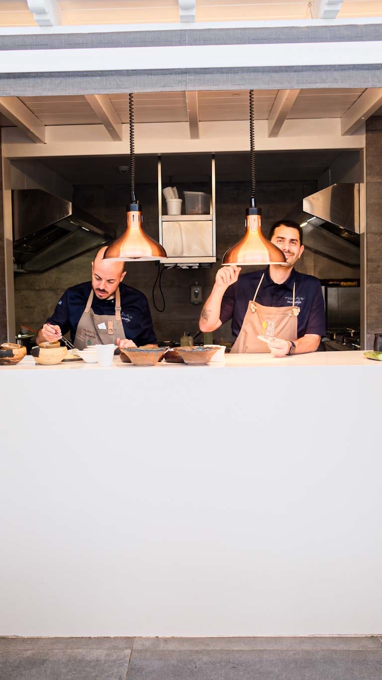 Restaurant Muxgo ligger i et eget bygg ved siden av hotel Santa Catalina. Et hvitt hus som minner om et luftig sommerhus ved kysten. Det er høyt under taket, gardinene er florlette og vaier i vinden fra de åpne vinduene. Det er få, men store bord. Kjøkkenet kan skimtes gjennom en åpning i veggen, der vi kan se kokkene i aksjon der de anretter maten på rustikke keramikk-tallerkner og skåler.