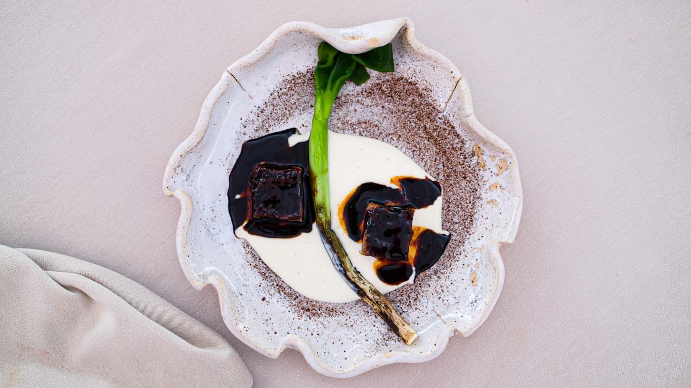 Høydepunktet i menyen var nok hovedretten, som besto av geitestuing som var presset sammen som to firkanter, servert med en kraftig rødvinsaus, luftig og fløyelsmyk potetmos og grillet vårløk. Enkelt, men samtidig fantastisk godt.