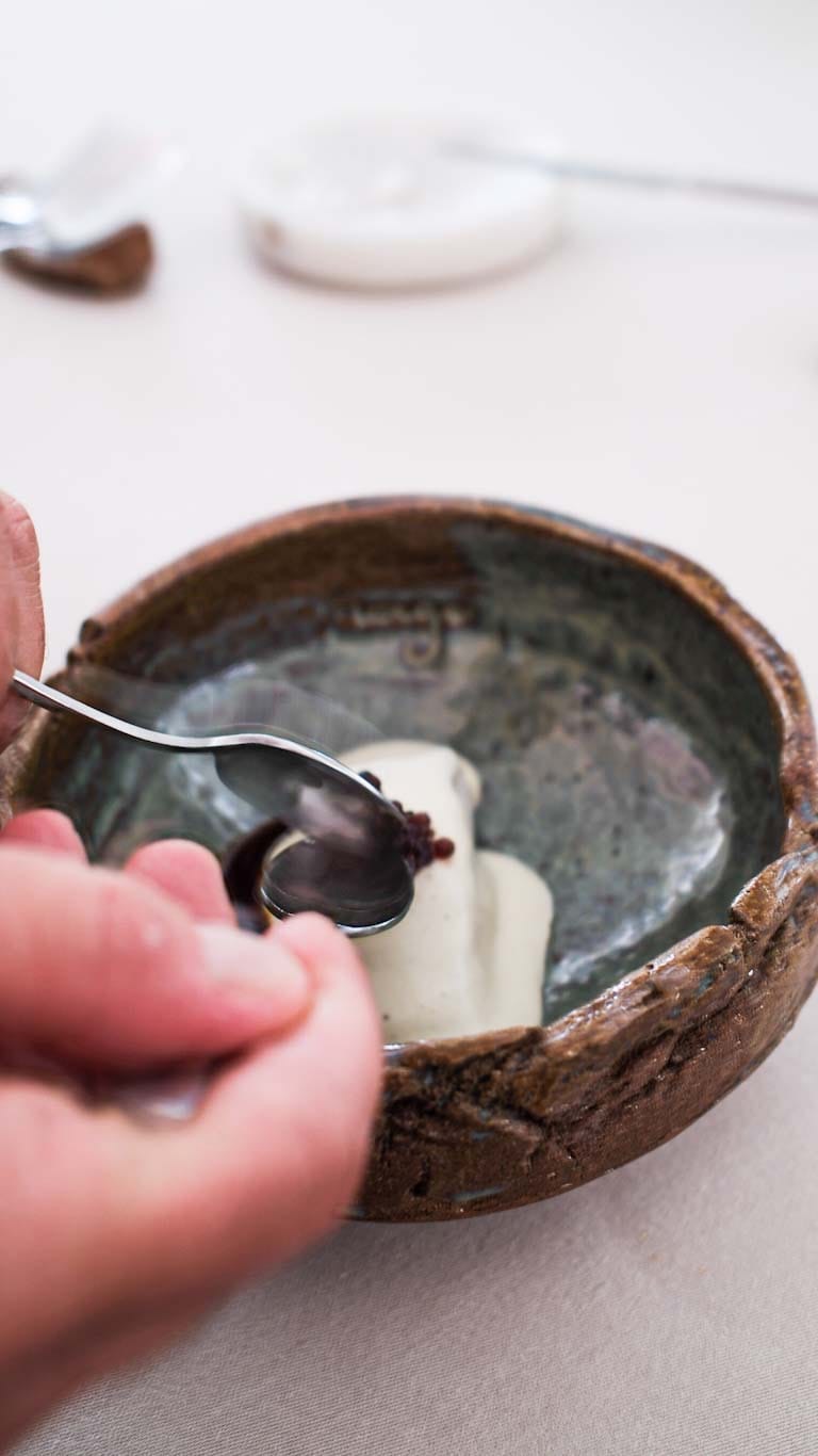 Det morsomste med hele måltidet var nesten å se keramikken de brukte. Rustikke og uperfekte tallerkner og skåler i grov leire som sto i kontrast til det lyse og rene lokalet.
