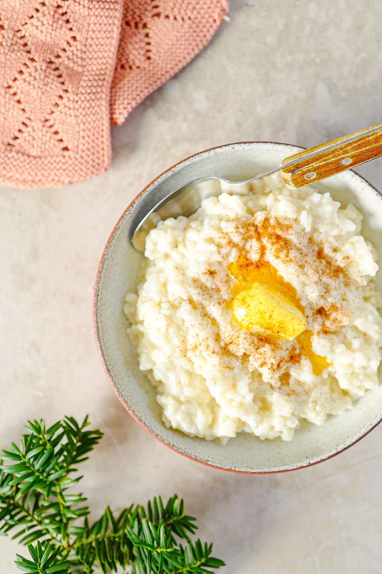 Topp risgrøten med godt smør og kanel før servering.