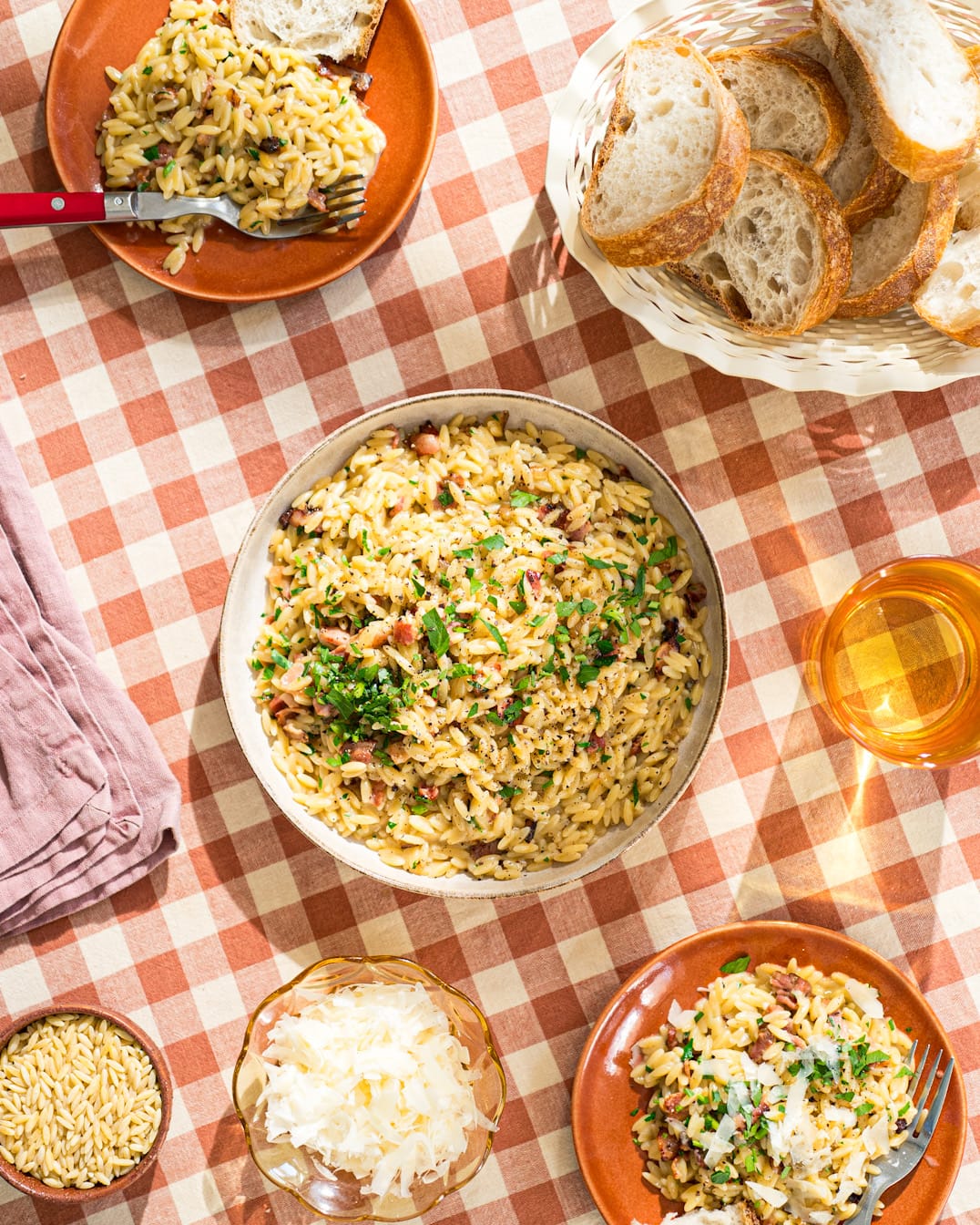 Mens risoni koker, stek bacon i en tørr stekepanne over middels varme. Når baconet begynner å bli sprøtt tilsetter du løk og hvitløk og stek i ca. 1 minutt til løken er myk og gyllen.