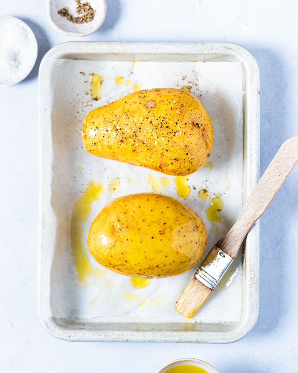 1:Legg bakepotetene på et brett med bakepapir. Pensle potetene med olivenolje rundt hele, og krydre med salt og pepper.