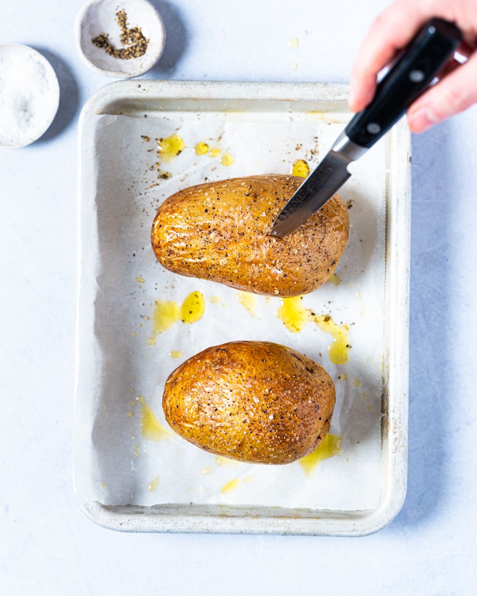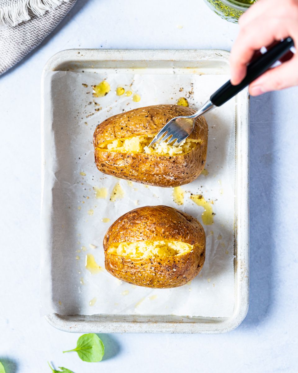 2:Stek potetene ved 180 °C i 45–60 minutter til de er helt møre. Stikk en kniv ned i potetene. Hvis kniven ikke møter motstand og poteten slipper kniven lett, så er potetene ferdige.